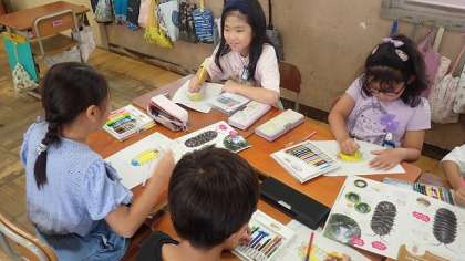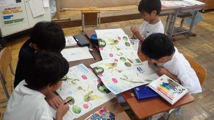 カマキリやバッタ、カブトムシにダンゴムシなど、図鑑でいろいろな虫の体のつくりを観察し、「あたま」「むね」「はら」の部分ごとに色分けをしています。あしは何本で、どこから生えているでしょう?しっかり確かめながら学習を進めていました。