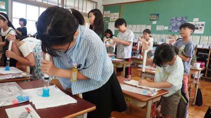 筒の中に、水と空気をとじ込め、押し棒で力をかけておし縮めるとそれぞれの体積がどのようになるかを調べました。子どもたちは、水の水位が上がる(体積が大きくなる)のではないか、空気の体積は小さくなるが、水の体積は変わらないのではないか、などの予想を立てました。