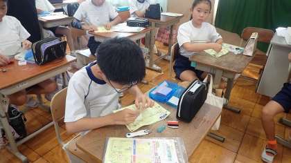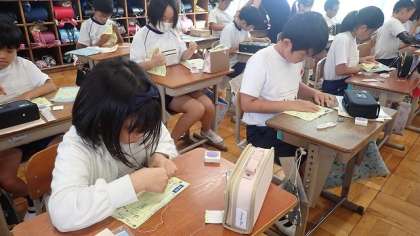 これまでに、裁縫セットを使って玉結び、玉止め、なみぬいを学習しました。今日は、練習布をつかって、すべてをひと通りやってみました。まだまだ慣れないのでうまくいかないことも多いですが、これからもくり返し練習をすることが上達の近道ですね。