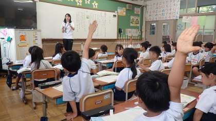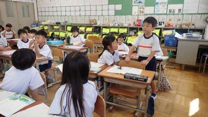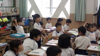 お話を読み。登場人物の「木」と「けんかをしているあおむし」がどんな気持ちでいるかを考えて発表しています。登場人物に口調までなり切って、発表している子もいました。