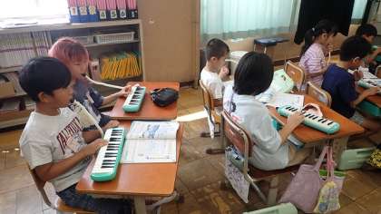 鍵盤ハーモニカで「かえるのがっしょう」や「ぷっかりくじら」を演奏しています。正しい指づかいと、しっかりタンギングを意識して演奏することができました。