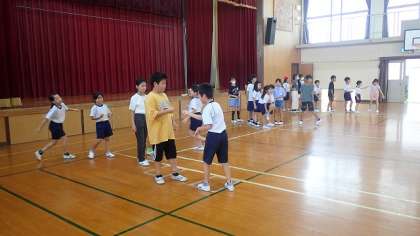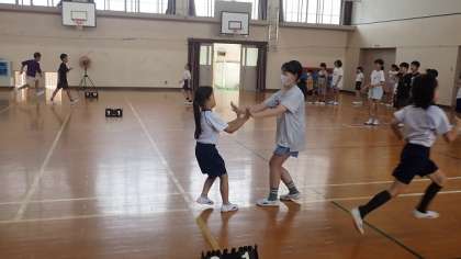 今日は、5年1組と2年1組の子どもたちが体育館にやってきて一緒に活動しました。5年生が2年生のことを考えながら一緒に楽しみました。