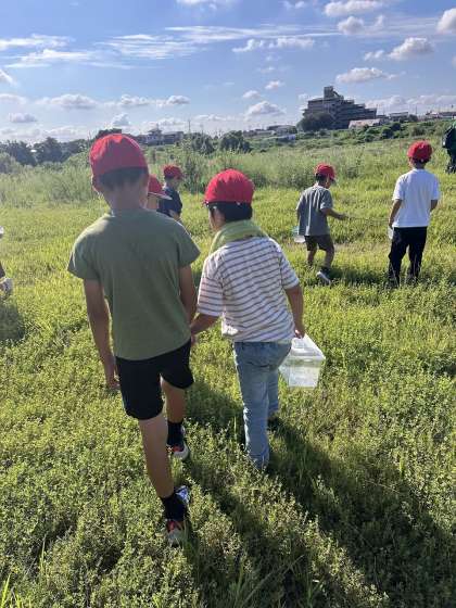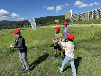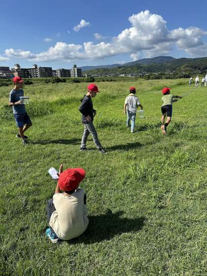 1年生と一緒に桂川の河川敷に虫取りへ行きました。トンボがたくさん飛んでいていて、アミで捕まえるのに必死な子どもたちでした。虫が苦手な人もカゴに入った虫をじっと観察するなど、できることを楽しんでいました。