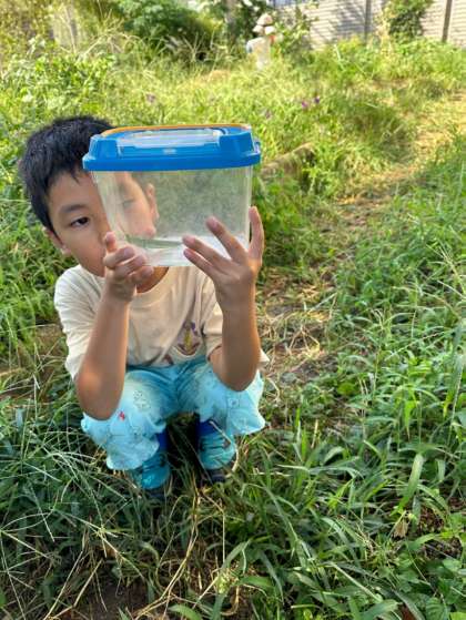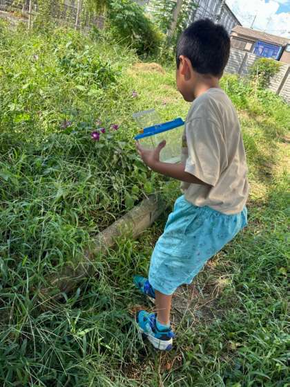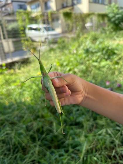 大きなショウリョウバッタを先生に捕まえてもらい、みんな大興奮でした。一緒に学校に戻って、観察シートを書きました。一通り触れ合いを楽しんだ後は、空いた時間にむくのき畑へ返しに行きました。返す時には、怖いけれど触ってみたい!という思いから何度も挑戦して、バッタをつかむことができました。