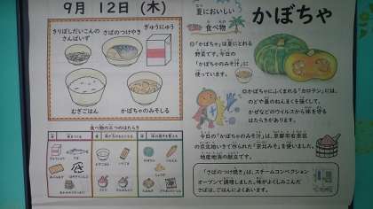 「さばのつけ焼き」は、さばの切り身をしょうがやしょうゆなどに漬け込んで味をしみこませてから、スチームコンベクションオーブンを使って焼きました。皮も香ばしく焼けており、さばの味がごはんにぴったりの献立でした。かぼちゃは夏にとれる野菜で、かぼちゃに含まれる「カロテン」には、のどや鼻の粘膜を強くして、かぜなどのウイルスから体を守る働きがあります。今日は、京北みそを使った「かぼちゃのみそ汁」でいただきました。