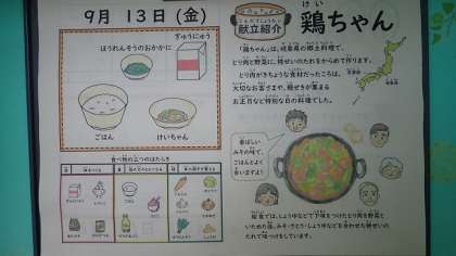 「鶏ちゃん」は岐阜県の郷土料理で、とり肉と野菜に特製のたれを絡めてつくります。鶏肉が貴重な食材だったころは、大切なお客さまや親戚が集まるお正月など、特別な日の料理だったそうです。給食では、しょうゆなどで下味をつけたとり肉を野菜と炒めたあと、みそ・さとう・しょうゆなどを合わせた特製のたれで味付けしました。香ばしいみその味が、ごはんによく合う献立でした。