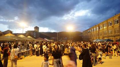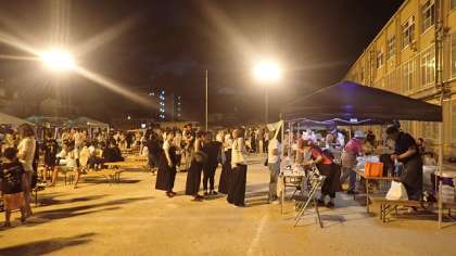 子どもたちもたくさんやってきました。お目当ての食べ物やあて物のお店に並び、長い行列をつくっています。