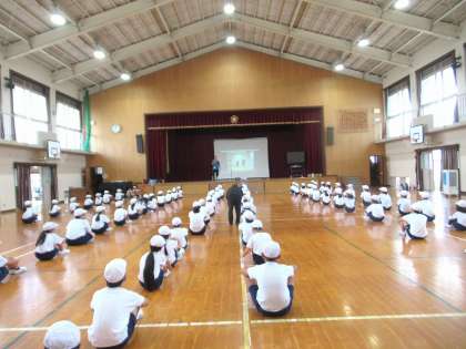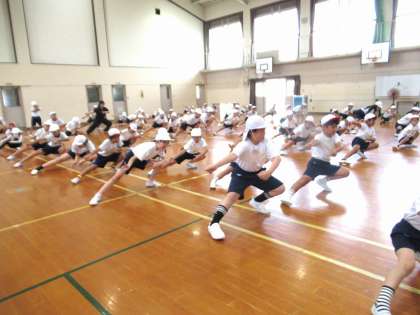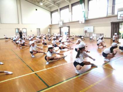 今日で、運動会までちょうど1か月です。今日から、学年での「民舞」の練習が始まりました。今日練習をしたのは、一番よく出てくる動きです。腰をしっかり落として、力強い動きになるように、体全体で表現していきました。