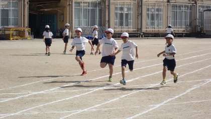 先生のスタートの合図に合わせて勢いよくスタートを切り、しっかり腕を振って走っています。