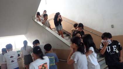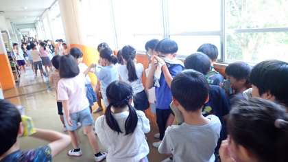 放送で火災発生の連絡が入ると、担任の先生の指示に従って、整然と避難を始めました。煙を吸い込まないようにするために、手に持ったハンカチで鼻と口を守ります。