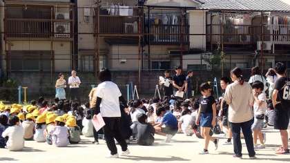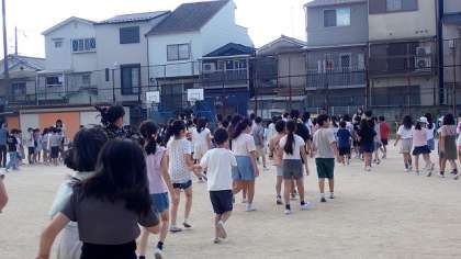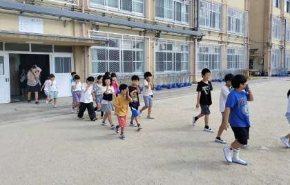 火災現場から離れた階段を使って運動場に避難し、列を作って人数確認をしました。おしゃべりをせず、真剣に訓練に取り組むことができています。