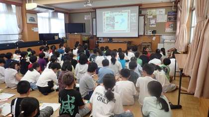 オンライン社会見学では、製造工程や働いている方々がどのような仕事をされているのかなどについて教えていただきました。また、子どもたちからの質問タイムも設けていただき、質問する子がカメラの前に出て代表で質問をしました。子どもたちの質問にもていねいに答えていただき、初めて知ったことには子どもたちからも「えーっ!」という驚きの声が上がっていました。