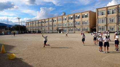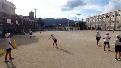 今日は、遠投の活動をしています。ボールを遠くに投げるために体の捻り戻しをスムーズに行ったり、投げる角度を考えたりしながら活動していました。