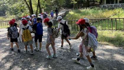 バスを降りてから、みんなで列になって公園まで歩いていきます。途中、カモやちょうちょうなどを見付けたり、ドングリを拾ったりしながら歩いています。