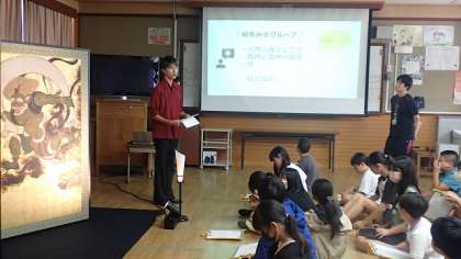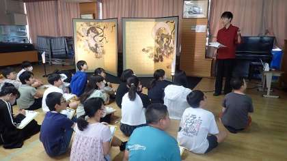 「文化財に親しむ授業実行委員会」の主催で、大学生や大学院生の文化財ソムリエの先生に文化財に親しむ授業をしていただきました。今日、梅津小学校に持ってきていただいたのは、俵屋宗達 筆の「風神雷神図屏風」です。(京都国立博物館に所蔵されている原物の、高精細複製品です。)