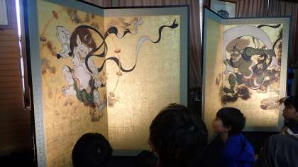 俵屋宗達や「風神雷神図屏風」についてのお話を聞かせていただいた後は、屏風を間近でじっくり観察したり、絵を描くために使われていた絵の具の原料や金箔などを見せていただいたりしました。
