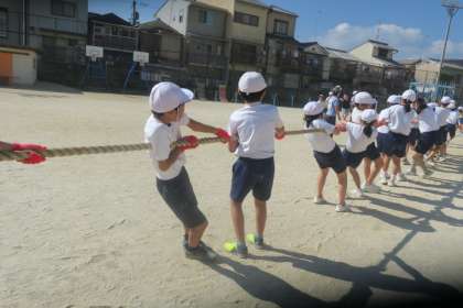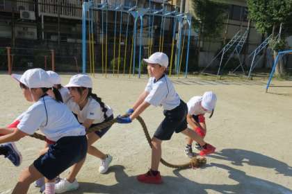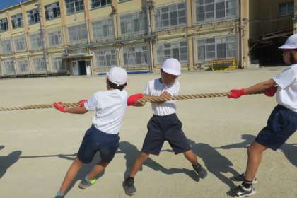 運動会に向けて、それぞれの学年で練習を頑張っています。5年生は綱引きに取り組み、クラスごとのカラー軍手をはめて、力いっぱい綱を引いています。各クラスで作戦を考えているので、見ていても、とても面白いです。