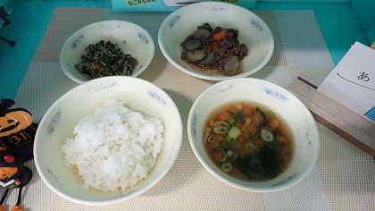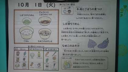 今日は、10月の和献立の日です。「牛肉とごぼうの煮つけ」は、牛肉とにんじん、旬のごぼうを使用し、しょうゆであまからく煮つけました。「しば漬ちりめん」には、「しば漬」が使われています。「しば漬」は、なすをしその葉とともにつけたもので、左京区の大原地区は「赤しそ」の産地として有名です。しば漬、だいこん葉、しらす干しの食感を味わっていただきました。