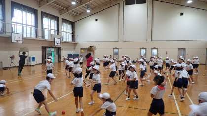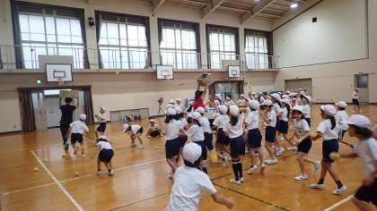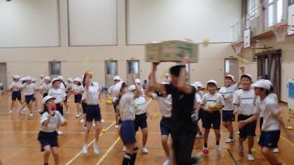 子どもたちは、手に玉を持ち、走って逃げる先生の頭上の箱をねらっています。ちょっと変わった玉入れ競技ですが、子どもたちもとても楽しそうです。