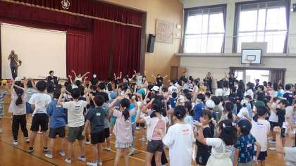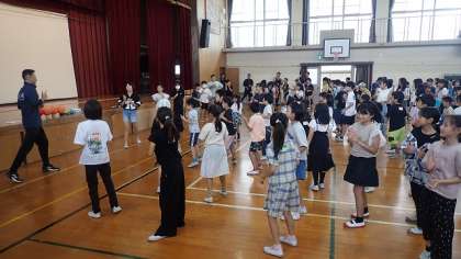 支部長さんのご挨拶のあと、みんなで準備運動のダンスを踊りました。運動会でダンス係をする6年生も前に出て、一緒に踊ってくれました。