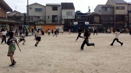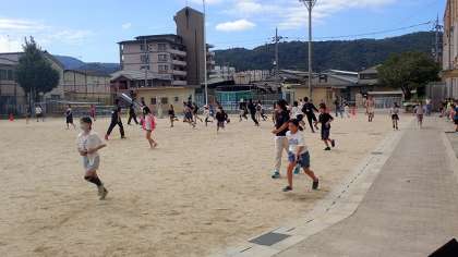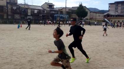 運動場で行われたのは、テレビでもおなじみの「逃走中」です。黒い服を着た「ハンター」が運動場に放たれると、子どもたちは一斉に逃げ出します。が、相手は中学生や大人たちです。必死に逃げますが、なかなか逃げ切ることはできなかったようです…。