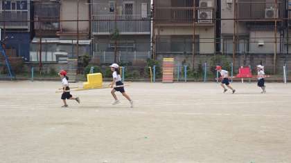 「おみこし わっしょい」では、段ボールで作ったおみこしを土台に乗せて、2人1組で運んでリレーをします。おみこしを崩してしまうと積み直しをしなければならないため、時間のロスになってしまいます。ペアと息を合わせて運んでいました。明日の運動会本番でも、慌てず落ち着いてがんばってくださいね!