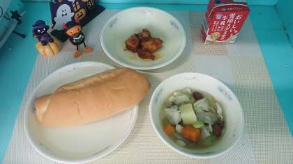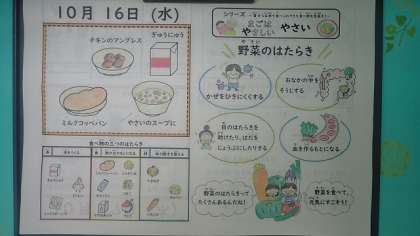 「アングレス」とは「イギリスの」という意味のフランス語です。給食では、とり肉を油でからっと揚げて、トマトケチャップ・ウスターソース・さとうで作ったソースを絡めて作っています。やわらかい鶏肉の食感と、甘辛いソースを味わっていただきました。