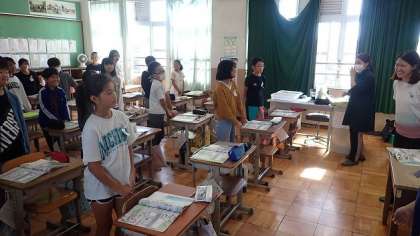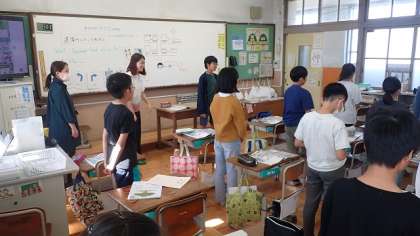 今日は、道案内の仕方について学習しました。向きを変えるときには、“Turn right.”や“Turn left.”などで指示を出すことを知り、“Simon says”(船長さんの命令)ゲームをして表現に慣れ親しんでいました。