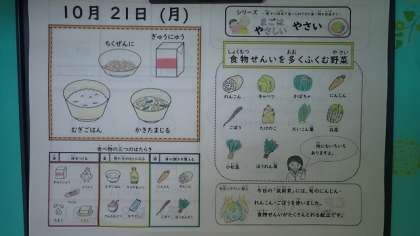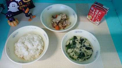 「筑前煮」は、煮る前に油で炒めています。油で炒めているので、鶏肉の脂と一緒になってコクが出てごはんによく合います。れんこんやごぼうの食感もよく、おいしくいただきました。「かきたま汁」は、カレーやプリプリ中華炒めとならび、実は子どもたちに人気のある献立です。ふわふわのたまごを味わって、おいしくいただきました。