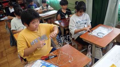 そのままでは決して立つことのない「針金」ですが、ねじったりつなげたりして形を変えると、針金を立ち上がらせることができます。思い思いに針金の形を変えながら、表したいものを表現しています。大胆な作品、細かい緻密な作品といろいろありますが、どの作品にも思いがあふれています。