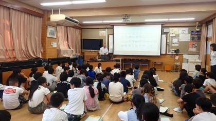 4年生は、社会の「昔から続く京都府の祭り〜祇園祭〜」の学習の一環として、ゲストティーチャーの先生をお招きして、祇園祭についての学習をしました。