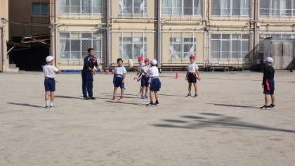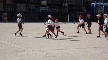 陣取りゲームとして行うのは「タグラグビー」です。名前の通りラグビー型のボールゲームで、腰に付けた「タグ」が対戦相手に取られると、3カウント以内にボールをパスしなければなりません。今日は、ルールや学習の進め方をみんなで確かめ、試合をしてみました。「前にボールをパスしてはいけない」と頭ではわかっているのに、ついつい前に投げそうになってしまいます。少しずつ、ルールに慣れながら、みんなで楽しく活動することができました。