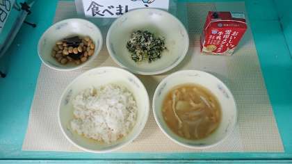 今日は、子どもたちが好きなまぜごはんの献立でした。「とりとだいこん葉のまぜごはんの具」は、ごはんと一緒に食べたときにちょうど良くなるように味付けがされています。チキンささみとだいこん葉の食感を楽しんでいただきました。「こんぶ豆」は、スチームコンベクションオーブンで調理しています。ふっくらとした大豆のや昆布のうまみを味わっておいしくいただきました。