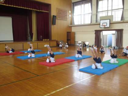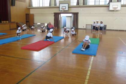 丸太になって転がったりうさぎになって跳んだりして体をほぐした後、前転の練習をしました。