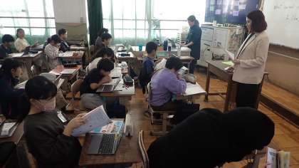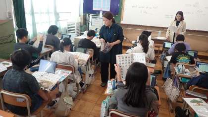 自分のオリジナルの街をつくるために、街にあるいろいろな施設やお店の英語での言い方を確かめています。ALTの先生に続いて、みんなでリピートしています。先生の発音をよく聞いてくり返すことができていました。