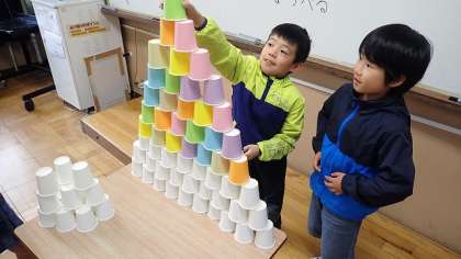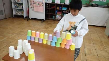 むくのき学級の教室には、たくさんの紙コップが用意されています。子どもたちも興味津々です。今日は、たくさんの紙コップを自由に使って、積んだり、並べたりして楽しみました。ひとりで積んだり、友達と一緒に重ねたりして楽しく活動しています。積みあがったものを崩すことも楽しかったようです。