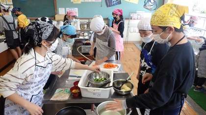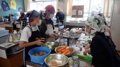 これまでに家庭科の学習で何度か調理実習をしてきた経験から、うまく分担をして調理を進めていきます。
