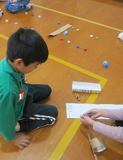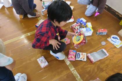 交流の様子です。時間内にどれだけ箱を積めるのかに挑戦していました。