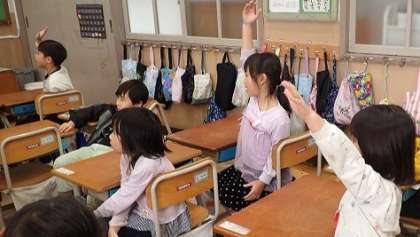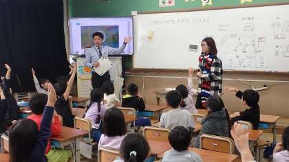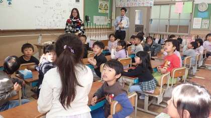1年生は、英語活動の「えいごとなかよし」学習をしています。