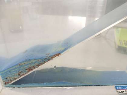 今週の学習で、地層がどのようにできるかを調べるために、れき・砂・泥を混ぜたカラーサンドを海に見立てた水槽に流し込んでいきました。
