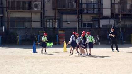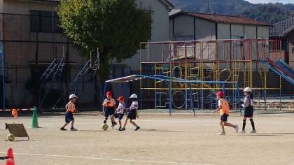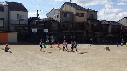 先週から単元の学習が始まったばかりなので、まだまだ「ボールをける」という動きに慣れていない子もたくさんいますが、はじめて試合をしました。うまくパスやシュートをできいこともありますが、楽しんで学習をしていました。