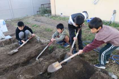 冬野菜を植えるために、畑を耕しました。硬くなった土を掘り返して柔らかくし、肥料と一緒に混ぜました。始めは「寒い。」と言っていた子どもたちでしたが、終わるころには「暑いなあ。」にかわっていました。