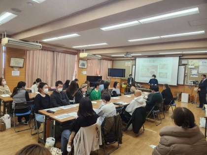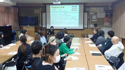 PTA副会長、学校長からのあいさつがあり、その後、栄養教諭から京都市の小学校給食についての説明をしました。内容は、第1回と同じで「安心・安全な給食についての取組」や「望ましい食習慣の形成に向けた取組」、「和食推進の取組」などについてです。