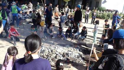 毎年恒例の行事で、今年度は200名を超える参加の申し込みがあり、たくさんの子どもたちでにぎわいました。全部で5つのグループに分かれて、火起こしをしました。普段はなかなかできない貴重な体験です。公園の中に足を踏み入れると、炭火の熱で暑いくらいです。火がいい感じになってくると、準備したおいもを投入しました。