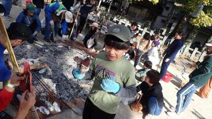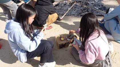 これまたあつあつのいもを割ると、きれいな黄金色のおいしそうな焼きいもが顔を見せました。やけどしないように気をつけながら、ほくほくの焼きいもをおいしくいただきました。