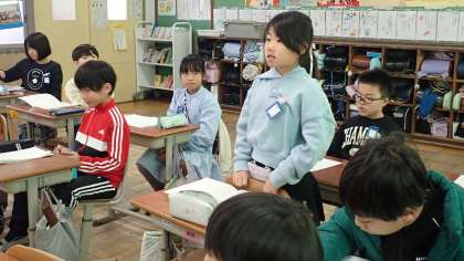 1列に並んだものの数と順序との関係を、図を使って考え説明する学習に取り組みました。言葉で聞くだけではわかりにくいものでも、図に表して整理してすると、どんな式で計算するとよいかがわかるようになりました。