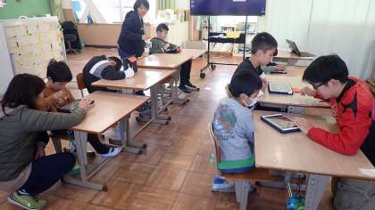授業のはじめにペーパークラフトの「おせち料理」を見せてもらい、いろいろな料理がぎっしり詰まっている様子に、子どもたちもわくわくしていました。