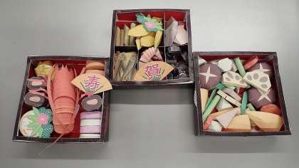 「おせち料理」に入れられている料理の中から13種類の名前や込められた願いについて教わり、その中から3種類を選んで自分が願いを込めたおせちを作りました。