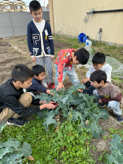 冬野菜のブロッコリーが育ってきたので、一つ収穫しました。「いつも何気なく食べているけれど、こんな風に出来るんだな。」「一つって、こんなに大きいんだ。」と驚きが多かったようです。
