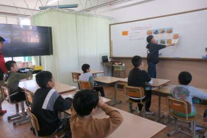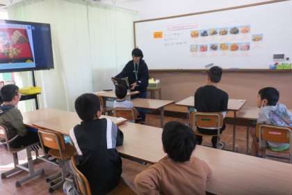 栄養教諭の先生にお正月に食べるおせち料理のことについて教えていただきました。一つ一つの具材に込められた願いを知り、ロイロノートを使って、それぞれでおせち料理をお重に詰めました。「健康になりたい。」「お金持ちになりたい。」「幸せに暮らしたい。」など様々な願いを込めたおせち料理が出来上がりました。